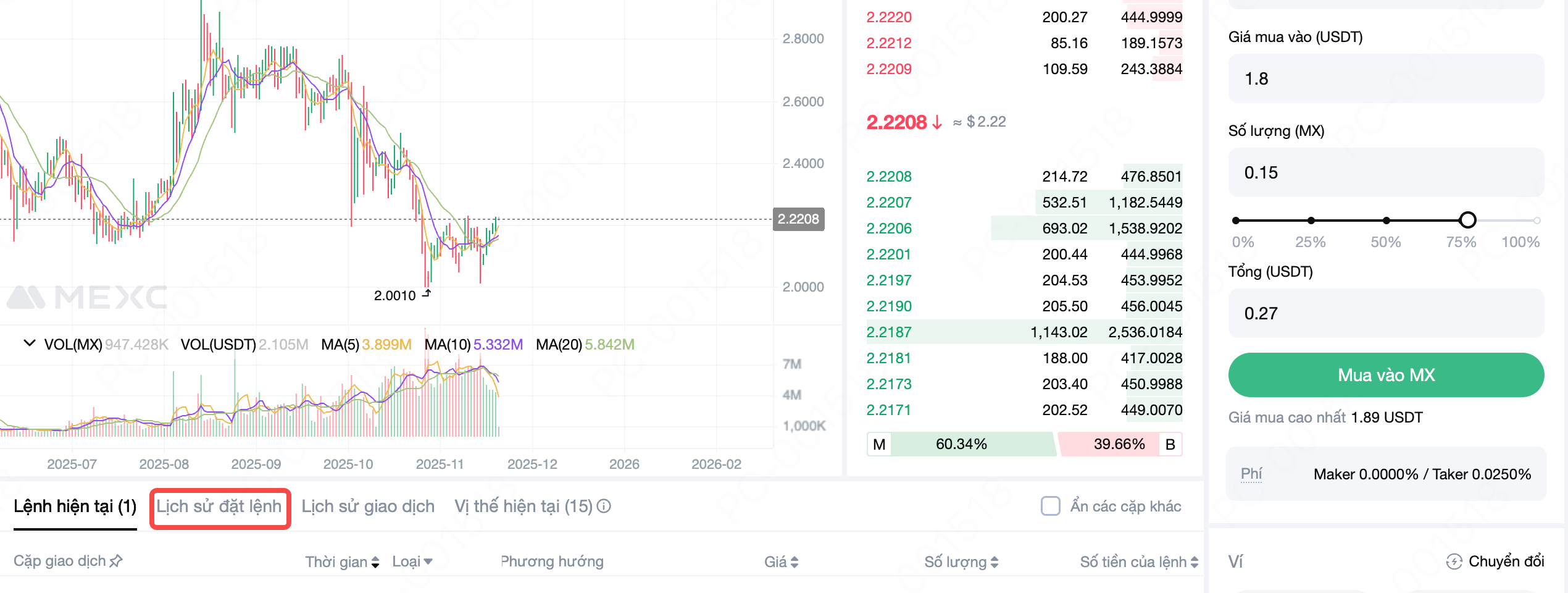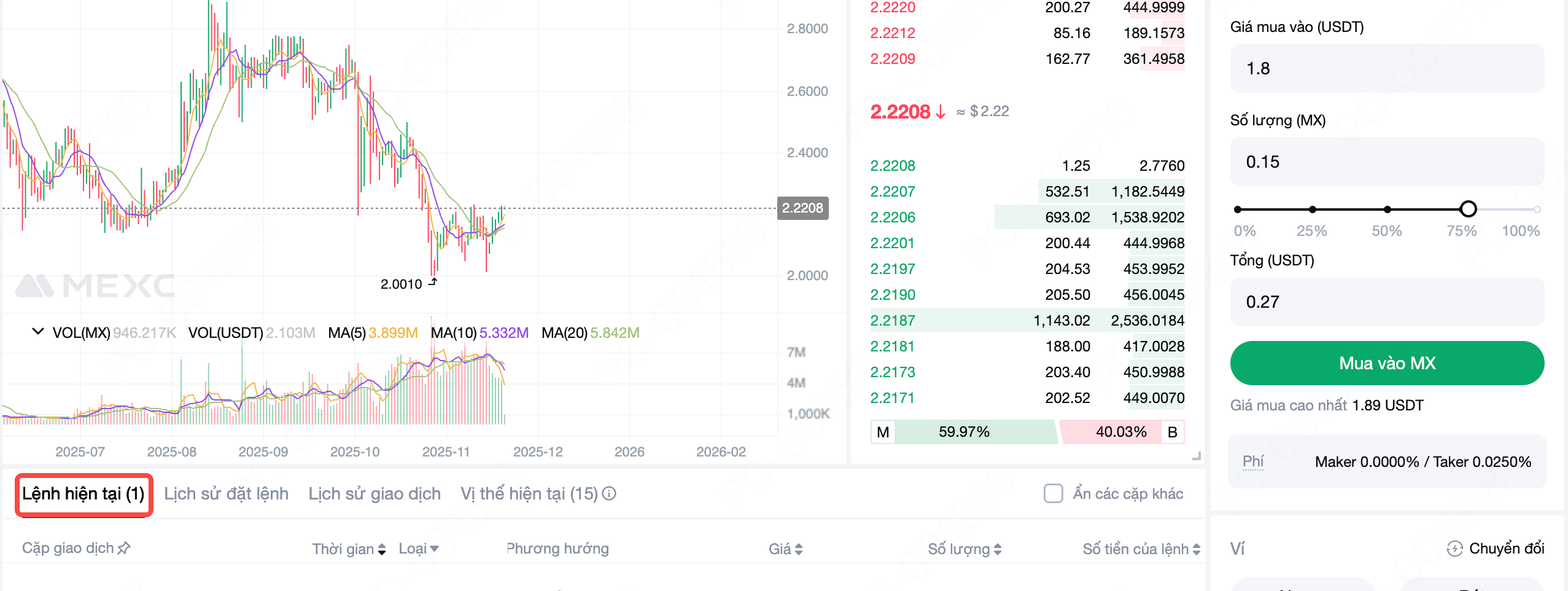 Giá hiện tại của MX là 2.1 USDT. Bạn tin rằng MX sẽ bật tăng sau khi giảm về 1.8 USDT, và bạn muốn mua MX ở mức giá 1.85 USDT.