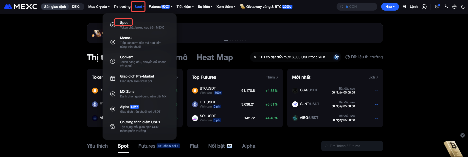 Truy cập trang web MEXC và đăng nhập vào tài khoản của bạn. Trên thanh điều hướng phía trên, tại mục Spot, nhấnSpot.