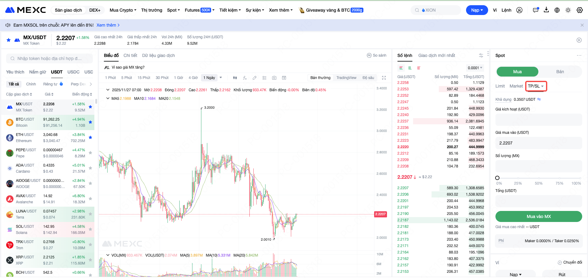 Trên trang giao dịch Spot, tại khu vực đặt lệnh, chọn loại lệnh TP/SL. Trong hướng dẫn này, chúng tôi sẽ mua MX để làm ví dụ minh họa.