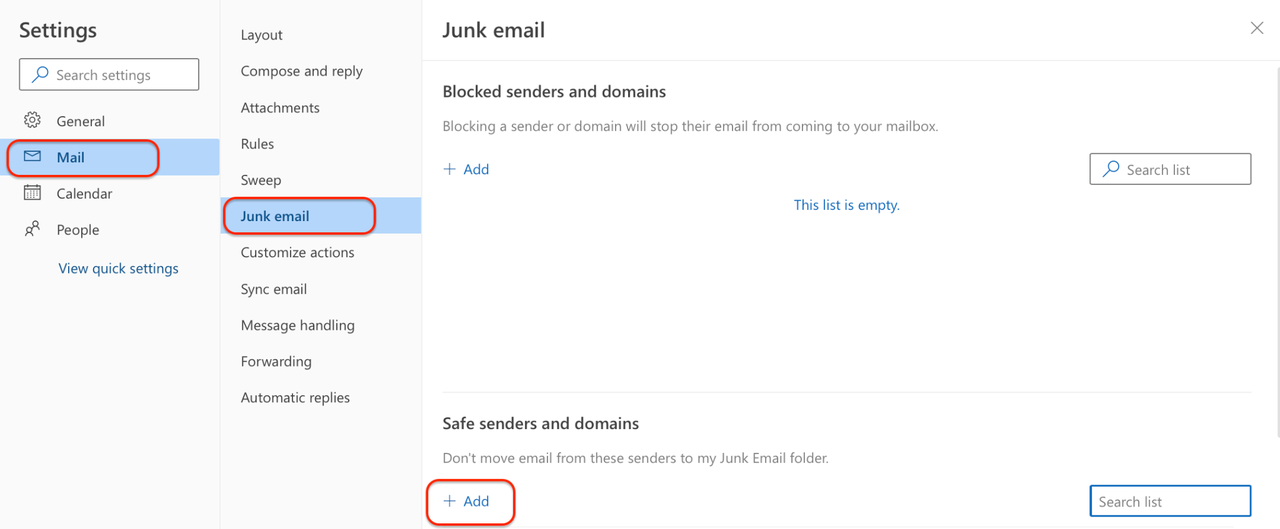 流程:【设定➡️检视所有outlook设定➡️邮件➡️垃圾邮件➡️安全的寄件者与网域】