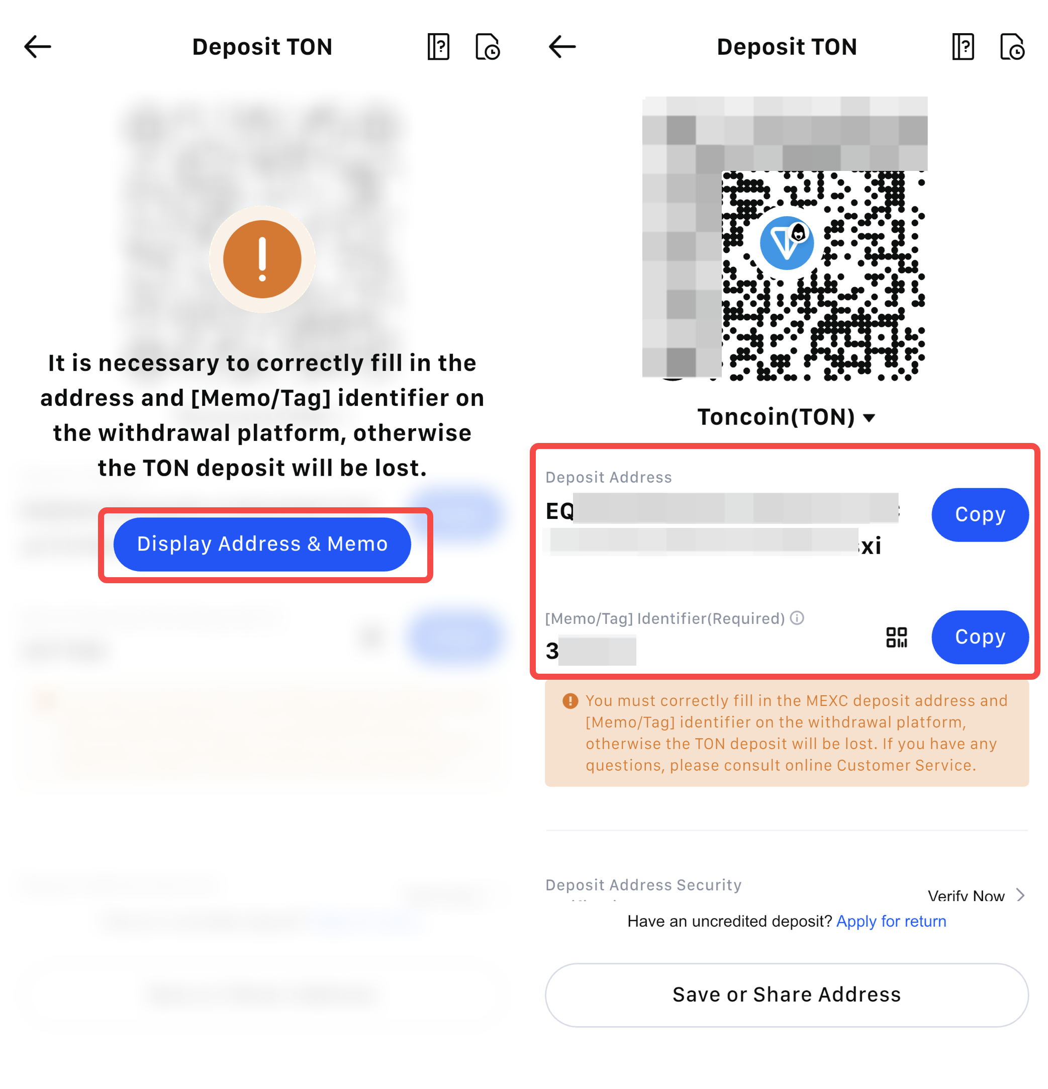 重要提示: 部分区块链网络(如 TON)在充值时需要同时填写地址和 Memo(备注标签)。如未正确填写 Memo,资产将无法到账。请仔细查看充值页面的相关提示。