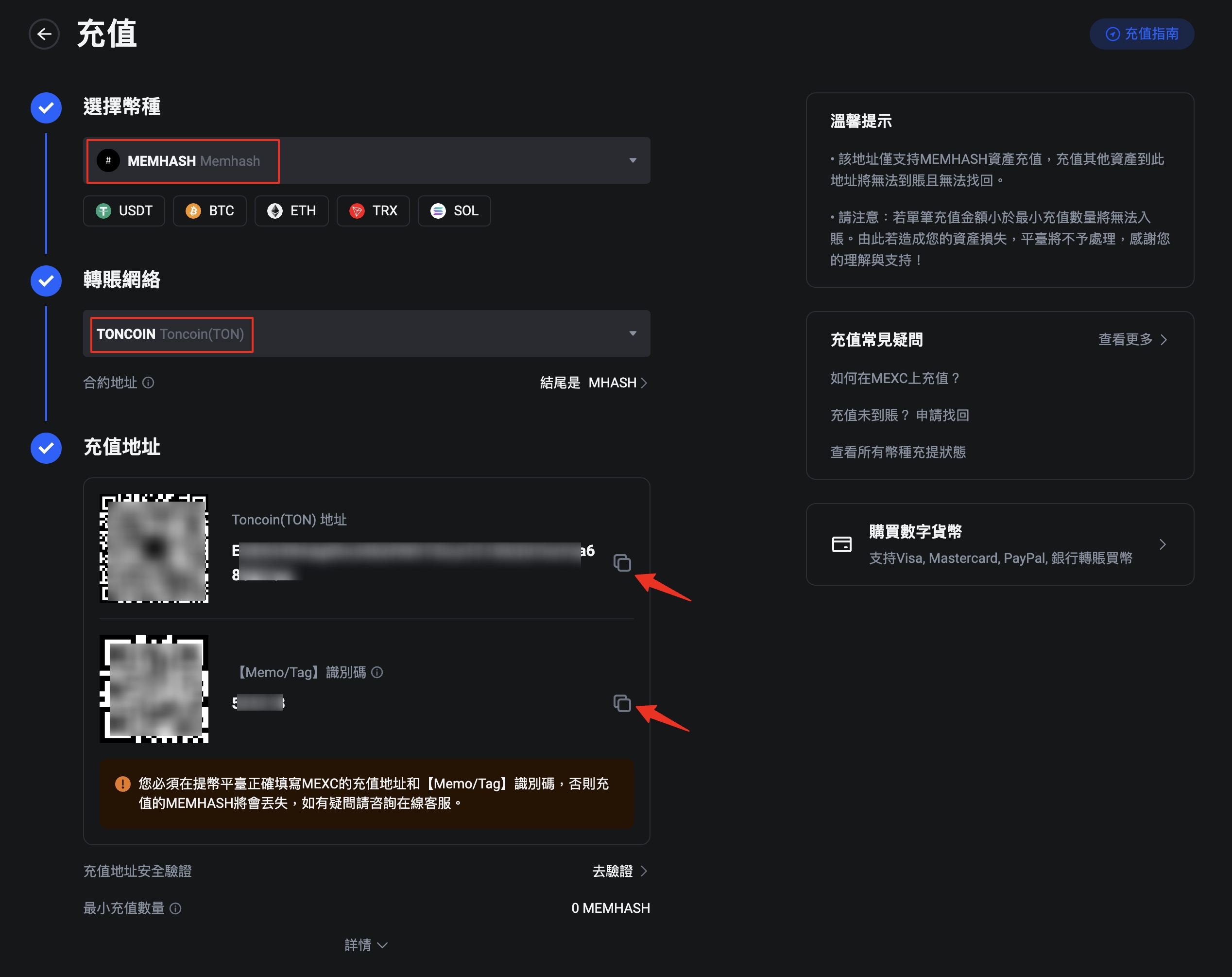 前往【資產】>【充值】>【選擇幣種 - MEMHASH】>【轉帳網絡 - TONCOIN】> 複製充值地址和Memo