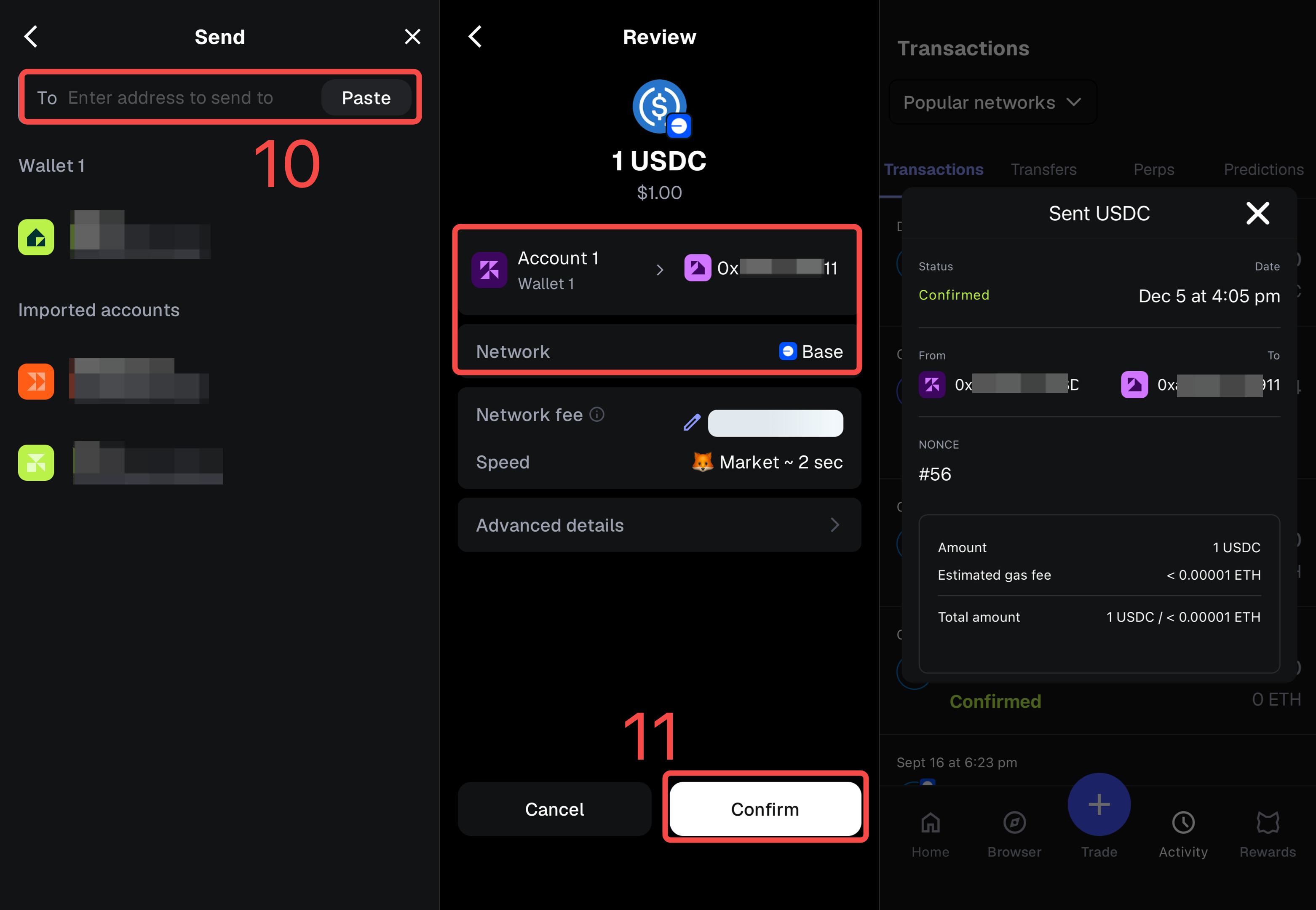 在搜索框中輸入【USDC】,並確認當前網路為【Base】。