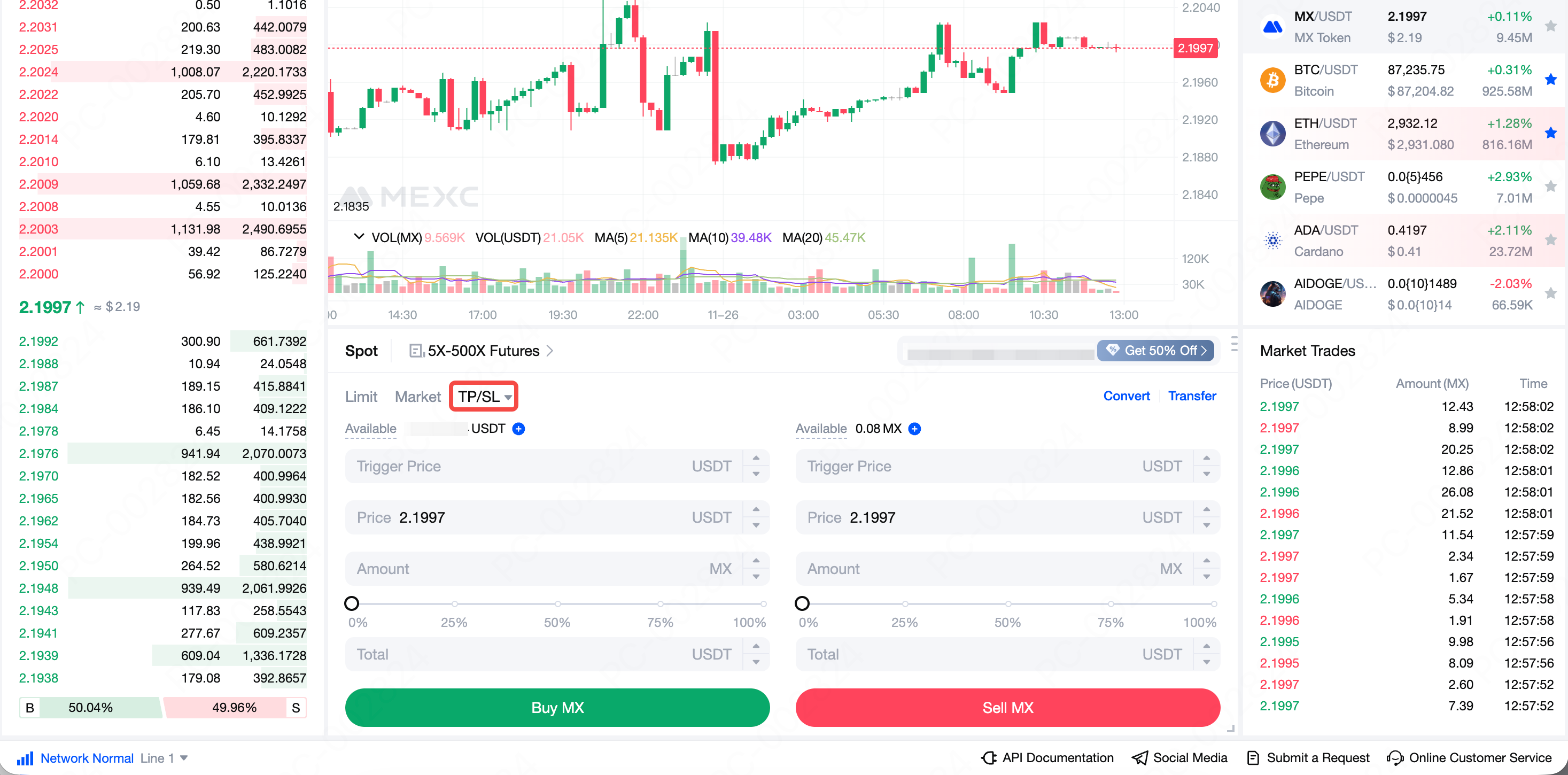 在現貨交易頁面的下單區,選擇【止盈止損】委託。我們以購買 MX 為例進行下單演示。